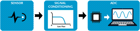 所有的數(shù)據(jù)采集系統(tǒng)都包括三個(gè)基本要素——傳感器、信號(hào)調(diào)理和模數(shù)轉(zhuǎn)換器(ADC)。