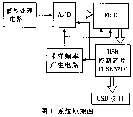 整個(gè)系統(tǒng)以TUSB3210為核心,負(fù)責(zé)啟動(dòng)A/D轉(zhuǎn)換,控制FIFO的讀寫及采樣頻率的設(shè)定,與主機(jī)之間的通信及數(shù)據(jù)傳輸。