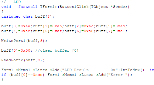 如圖所示,在應(yīng)用程序的源程序中,點(diǎn)擊ADD,發(fā)送的數(shù)據(jù)為“AA AB AC AD AE AF A0 A1”,這個(gè)就是我們要在USB通信過(guò)程中需要傳輸?shù)臄?shù)據(jù)。傳輸了這一組數(shù)據(jù)也就表示傳輸了ADD指令。