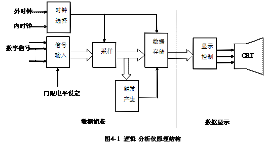 基于PC的邏輯分析儀主要包括數(shù)據(jù)捕獲和數(shù)據(jù)顯示兩大部分,其內(nèi)部結(jié)構(gòu)是利用時(shí)鐘從測試設(shè)備上采集和顯示數(shù)字信號(hào),由于數(shù)字系統(tǒng)的測試一般要觀察較長時(shí)間范圍的信號(hào)間邏輯關(guān)系或較長的數(shù)據(jù)流才能進(jìn)行分析,邏輯分析儀一般采用先進(jìn)行數(shù)據(jù)捕獲即采集并存儲(chǔ)數(shù)據(jù),然后進(jìn)行數(shù)據(jù)顯示并觀察分析的方式。因此邏輯分析儀內(nèi)部結(jié)構(gòu)可劃分為兩大部分:數(shù)據(jù)捕獲及數(shù)據(jù)顯示。數(shù)據(jù)捕獲部分包括信號(hào)輸入、采樣、數(shù)據(jù)存儲(chǔ)、觸發(fā)產(chǎn)生和時(shí)鐘電路等。外部被測信號(hào)送到信號(hào)輸入電路,與門限電平進(jìn)行比較,通過比較器整形為符合邏輯分析儀內(nèi)部邏輯電平的信號(hào)(如TTL電平信號(hào))。采樣電路在采樣時(shí)鐘控制下對(duì)信號(hào)進(jìn)行采樣,采樣獲得的數(shù)據(jù)流送到觸發(fā)產(chǎn)生電路進(jìn)行觸發(fā)識(shí)別,根據(jù)數(shù)據(jù)捕獲方式,在數(shù)據(jù)流中搜索特定的數(shù)據(jù)字(觸發(fā)字),當(dāng)搜索到符合條件的觸發(fā)字時(shí),就產(chǎn)生觸發(fā)信號(hào)。數(shù)據(jù)存儲(chǔ)電路在觸發(fā)信號(hào)的作用下進(jìn)行相應(yīng)的數(shù)據(jù)存儲(chǔ)控制,而時(shí)鐘電路可以選擇外時(shí)鐘或內(nèi)時(shí)鐘作為系統(tǒng)的工作時(shí)鐘。而外部結(jié)構(gòu)是通過USB總線或串行總線與計(jì)算機(jī)相連,通過計(jì)算機(jī)的強(qiáng)大功能完成各種時(shí)序分析,是計(jì)算機(jī)作為數(shù)據(jù)的顯示控制,顯示器和鼠標(biāo)、鍵盤作為邏輯分析儀的用戶面板,它相當(dāng)于一個(gè)多線示波器,如圖所示。