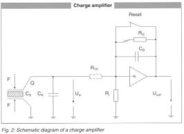 大部分電荷放大器有多個測試范圍。測試范圍的選擇是由開關電容CB決定的。放大器輸出是10V的信號,因此可以作寬靈敏度和寬測試范圍的傳感器單信號電荷放大器使用。電荷放大器的精度主要取決於電容CB的容限。電荷放大器有非常好的±0.05FS的線性度。當校正整個測試鏈或調整放大器和傳感器時,電荷放大器的錯誤可以忽略不記。在規(guī)格限定內,電荷放大器是有過載限定的。過載參數(shù)由信號回轉率和電荷數(shù)量確定。J-FET放大器在不適當?shù)膫鞲衅鬟B接時比MOS-FET對靜電放電更加敏感,但其有相當大的偏差和溫度依靠性。