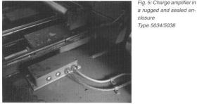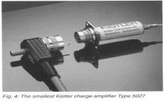 小型化Hybird技術使實際的電荷放大器變的更小更緊湊,他們能被非常近地裝在測試地點。直接放在機器上,因此縮短了傳感器和放大器之間的距離。Hybird技術也有安裝范圍。然而,可變測試范圍通過積分電壓放大器的方法來調節(jié)。當前最小的電荷放大器Type 5027(Fig.4)只有45mm×16mm,有3個測試范圍。