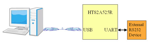 市面上有推出USB to UART的橋接器(Bridge)IC,為USB和人機(jī)介面裝置(HID)提供低成本且精巧的USB連接方桉,這些應(yīng)用包括個(gè)人醫(yī)療裝置、手機(jī)和無線電話、智慧卡和記憶卡的讀卡機(jī)(Card Reader)、個(gè)人數(shù)位助理(PDA)、MP3播放器、條碼讀取器、無線數(shù)據(jù)機(jī)以及工業(yè)控制系統(tǒng)等。而盛群的HT82A525R也可實(shí)現(xiàn)此應(yīng)用,但不同的是,其使用現(xiàn)有的全速(Full Speed)USB微控制器(MCU)去實(shí)現(xiàn),對使用者而言,可直接下載網(wǎng)站上的應(yīng)用范例,直接將一次性編程(OTP)燒錄在微控制器上,顯得更方便。