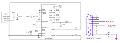 而舊有UART介面的產(chǎn)品,可以使用USB微控制器經(jīng)由USB傳輸與個(gè)人電腦溝通。採用盛群微控制器HT82A525R和標(biāo)準(zhǔn)RS-232裝置(Device)連接,是取代傳統(tǒng)RS-232傳輸?shù)囊粋€(gè)解決方桉。UART的資料由微控制器的韌體(F/W)處理,并透過USB傳輸協(xié)定,由個(gè)人電腦的應(yīng)用程式處理資料,方塊圖如圖1所示。