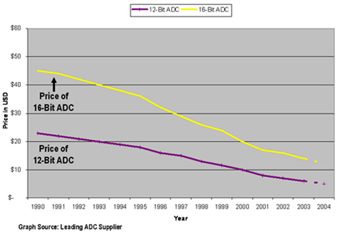 過去SSH架構(gòu)普遍用于中到高通道數(shù)的同步采樣系統(tǒng),主要是因為各個通道的成本所費不貲。然而,當此架構(gòu)在10多年前盛行之時,若與每個通道僅具備一組ADC/放大器相較,再多容納一組SSH電路的成本甚至更低廉(圖3)。在最近15年內(nèi),常見16位ADC的價位下跌將近75%,也因此每個輸入通道若使用ADC/放大器,可達更高的成本效益。