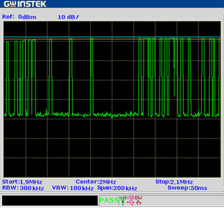 另外,可在頻譜分析儀上設(shè)置通過/失敗(Pass/Fail)的功率限制線(Limit Line),如圖5所示,使功率滿足限制范圍的信號(產(chǎn)品)通過。這一應(yīng)用只須在2.2.2的設(shè)置基礎(chǔ)上進(jìn)入限制線菜單進(jìn)行Pass/Fail功能設(shè)置即可,廠商分析儀產(chǎn)品限制線菜單的設(shè)置靈活,可以方便地編輯使用者須設(shè)定的功率上限和下限。限制線透過表格形式編輯在線的各點(diǎn),各點(diǎn)連成的限制曲線可滿足使用者在不同頻率點(diǎn)有不同功率標(biāo)準(zhǔn)的需要,而非簡單的直線,透過簡單幾個(gè)鍵的設(shè)置,頻譜分析儀即能幫助使用者將符合要求的信號判定為通過,而所有不符合要求的信號都將被準(zhǔn)確無誤地判定為失敗,圖6所示為通過測試時(shí)頻譜儀顯示的畫面。