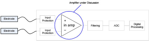 如同許多EEG以及ECG的設(shè)計(jì)廠商所知,在電極中的半電池電位差異可能會(huì)產(chǎn)生出大量直流電(DC)偏移,而此偏移必須是量測系統(tǒng)所能夠容忍的。CareFusion的現(xiàn)有系統(tǒng)在設(shè)計(jì)上可以處理高達(dá)±900毫伏特(mV)的偏移。為了要應(yīng)付在現(xiàn)場所遇到的不同電極類型以及環(huán)境條件,CareFusion希望將容錯(cuò)度提高到±1300毫伏特。與此同時(shí),他們正在考慮以電池供電設(shè)計(jì)的可能性,因此須要大幅降低所有組件的功率耗損,其中也包括儀表放大器。現(xiàn)有系統(tǒng)的功率耗損是每通道28毫瓦(mW),而設(shè)計(jì)廠商正在設(shè)法將其降低至10毫瓦或是更低。設(shè)計(jì)廠商所面對(duì)的是在ECG與EEG前端設(shè)計(jì)中(圖1),對(duì)于噪聲、偏移處理能力以及功率耗損等因素固有的權(quán)衡取舍。