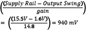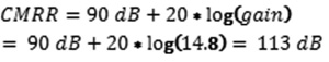 但是接著為了要以14.8的增益去處理900mV的電極偏移,就需要±15.5VDC的電源軌(參照公式4)。使用六十四組的這種通道去組成他們的EEG放大器時(shí),對(duì)于以電池供電的應(yīng)用裝置來說其功率耗損會(huì)太高。