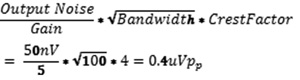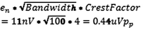 計(jì)算AD8221在0.1~100Hz BW的預(yù)期p-p噪聲,顯示出增益的影響(忽略了電流噪聲,因?yàn)殡姌O阻抗很低)。加入1/f噪聲(依據(jù)技術(shù)手冊使用增益=10)。
