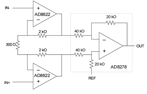 當(dāng)CareFusion發(fā)現(xiàn)ADI或是其它供貨商的儀表放大器都無法完全符合工程師們的需求之后,他們決定專注于自行設(shè)計(jì)上,并且了解到為了要有小于100分貝(dB)的CMRR,在減法器級(jí)中具有匹配電阻是相當(dāng)重要的。過去工程師們已經(jīng)使用匹配電阻網(wǎng)絡(luò)實(shí)驗(yàn)過,但卻發(fā)現(xiàn)這種方式很昂貴,而且似乎是無法獲得預(yù)期的CMRR性能,而這有可能是因?yàn)殡娐钒迳系募纳娙菟鶎?dǎo)致。工程師們很快的發(fā)現(xiàn)到AD8278差動(dòng)放大器擁有他們一直在找的性能以及功率消耗。