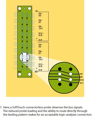 現(xiàn)在考慮一個(gè)替代方案,即采用E5390A軟接觸無連接器探頭。此時(shí)可將信號(hào)連接到探測點(diǎn)的測試焊盤(見圖7),這意味著不會(huì)給系統(tǒng)增加額外的走線電容。該探頭的網(wǎng)絡(luò)電容為0.7 pF,通過采用這種連接,可在不導(dǎo)致系統(tǒng)失效的情況下進(jìn)行邏輯分析。