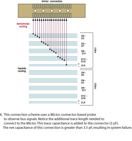 使用錯(cuò)誤的連接方法 假設(shè)用邏輯分析儀觀察一個(gè)系統(tǒng)的PCB上兩個(gè)器件之間的信號(hào)。該信號(hào)走線布在PCB表層,若負(fù)載超過3.5pF,則會(huì)導(dǎo)致系統(tǒng)失效。設(shè)計(jì)工程師利用基于Mictor連接器的探頭E5380A來觀察信號(hào)。 由于連接器的管腳分布和結(jié)構(gòu),信號(hào)不能用過它直接連接。這迫使設(shè)計(jì)工程師將連接器放在走線層,并對(duì)每個(gè)信號(hào)增加過孔。于是,對(duì)連接器的走線連接利用另外一層PCB層完成,其走線方向與原始信號(hào)的走線垂直。圖6顯示了該連接器的布線圖。