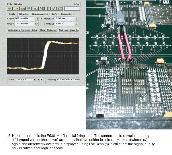 毫無疑問這樣的波形是不可接受的。解決的辦法是直接在接收器上進(jìn)行探測。BGA封裝最近的物理探測點(diǎn)可能是PCB底面的引線過孔焊盤。圖5a展示了一種新的連接方案,它直接用焊料將飛線連接到BGA的引線過孔焊盤。圖5b是測試到的信號(hào)波形。