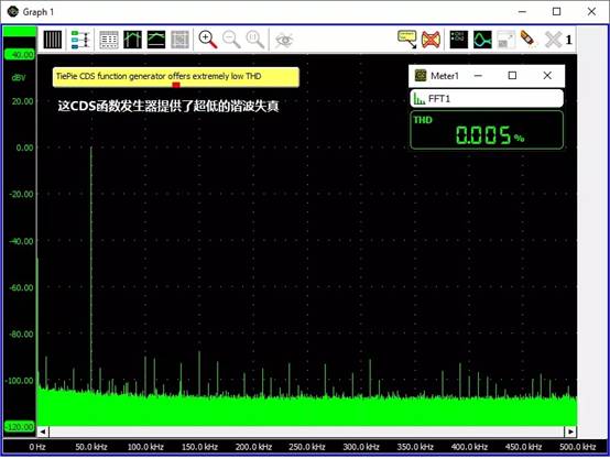 上圖CDS發(fā)生器提供了同類中最低的諧波失真THD。50 kHz 0 dB正弦表示-90 dB二次諧波和-88 dB三次諧波。