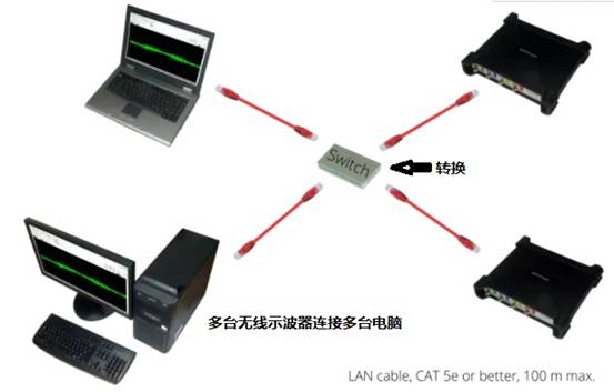 一臺(tái)或多臺(tái)PC連接到有線網(wǎng)絡(luò)中的一臺(tái)或多臺(tái)以太網(wǎng)示波器