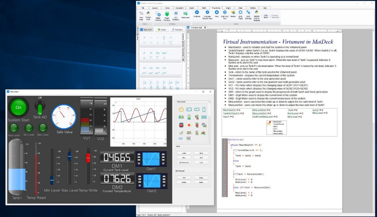 Virtument 是 MatDeck 虛擬儀表板,它允許使用數(shù)字儀表、滑塊、水箱、儀表等視覺輔助工具在設備和 MatDeck 之間進行通信。Virtument 是一個無代碼工具箱,這意味著不需要編程知識,因為用戶只需單擊幾個按鈕即可創(chuàng)建與設備的連接并向其添加虛擬儀器。然而,用戶可以選擇添加代碼、GUI 和功能來使用虛擬儀器。