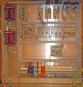 右側的3個中心板是用于模擬輸入的溫度傳感器調節(jié)器和濾波器板。左上角是一個繼電器板,用于打開/關閉風扇的電源。旁邊是PWM模擬風扇控制器。底部的單獨板清理和去抖動流量脈沖信號,中間左側是一個多路復用板,它將流量轉速信號饋送到1個計數器。3條數字I/O線切換多路復用板以解決要測量的流量脈沖。