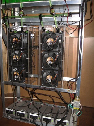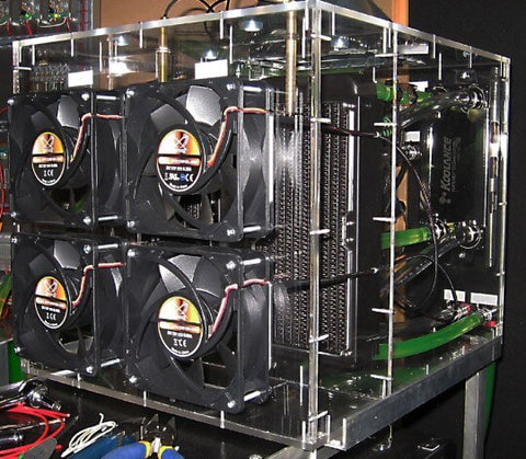 右邊地板上的藍色隔熱水箱是一個標準的25加侖魚缸,水箱內部是兩個標準水族箱泵。一個將流體泵送到右下角很難看到的冷卻器,另一個將流體泵送到板式熱交換器。一些管道覆蓋有絕緣層以幫助防止冷凝。另請注意(左上角)HVAC系統(tǒng)通過管道連接到散熱器和板式換熱器箱中,以預冷空氣。