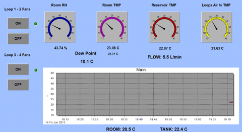 主屏幕顯示室溫、濕度和露點,以便在發(fā)生冷凝時一目了然。ReservoirTemp是Mosfet回路的回路5的溫度。Loop air in temp是被推入電腦支架頂部亞克力盒的空氣溫度。然后是手動散熱器開/關風扇控制按鈕。