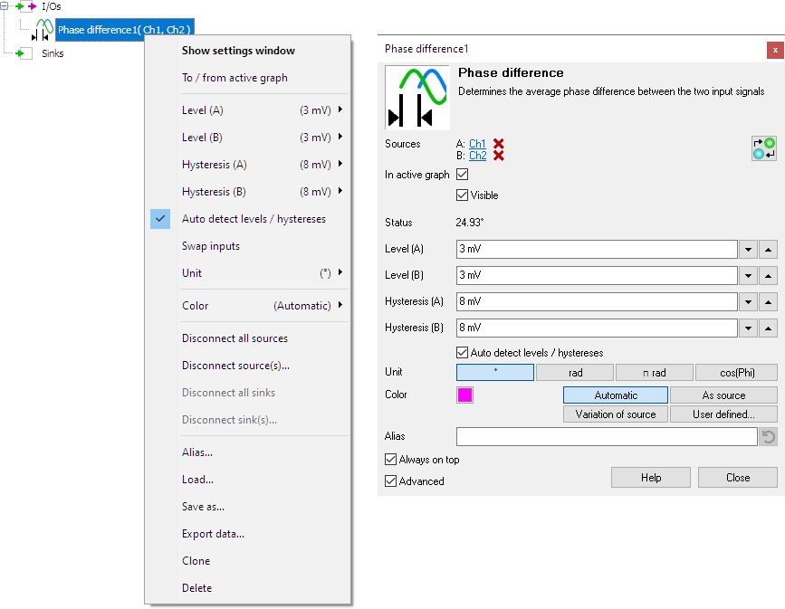 相位差 I/O決定其兩個(gè)輸入信號(hào)之間的相位差。兩個(gè)輸入信號(hào)必須有相同的頻率,必須有足夠大的幅度,以便能夠相位差I(lǐng)/O在兩個(gè)輸入信號(hào)中尋找所有上升斜坡的位置。然后確定相應(yīng)的上升斜率之間的相位差異。相位差I(lǐng)/O返回一個(gè)值,即測(cè)量信號(hào)之間的平均相位差。