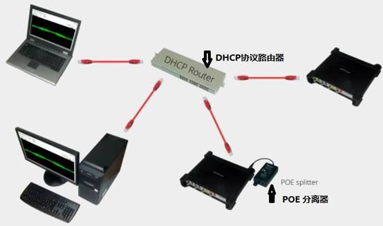一臺(tái)或多臺(tái)PC連接到有線網(wǎng)絡(luò)中的一臺(tái)或多臺(tái)無(wú)線示波器無(wú)線示波器由其內(nèi)置UPS電池、以太網(wǎng)電源或外部電源供電。