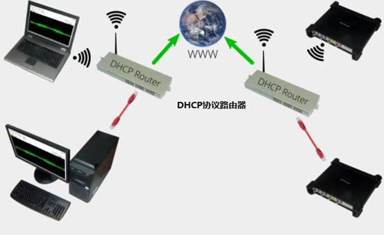 第九種:經(jīng)互聯(lián)網(wǎng)多臺(tái)無(wú)線示波器進(jìn)行全球測(cè)量高速流盤數(shù)據(jù)采集與采樣率高達(dá)5 MSa/s是可能的。通過(guò)internet一臺(tái)或多臺(tái)遠(yuǎn)端無(wú)線示波器可連接到一臺(tái)電腦或多臺(tái)電腦無(wú)線示波器由其內(nèi)置UPS電池、以太網(wǎng)電源或外部電源供電。