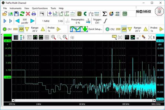 高細(xì)節(jié)頻譜分析儀高精度多通道示波器軟件頻譜分析儀充分利用了高分辨率USB手持示波器的深內(nèi)存。不僅給深內(nèi)存一個(gè)難以置信的低分辨率帶寬只有7.45赫茲在500兆赫的頻率跨度,它還提供了140分貝的垂直動(dòng)態(tài)范圍。快速而強(qiáng)大的FFT程序,具有許多用戶可選擇的窗口功能,允許您看到信號(hào)中最小的頻率成分。多通道示波器軟件頻譜分析儀的多顯示選項(xiàng)允許同時(shí)查看頻譜的多個(gè)部分,從而更好地理解所分析的信號(hào)。