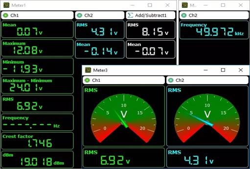 多通道軟件的快速設(shè)置:為了簡(jiǎn)化測(cè)量設(shè)置,多通道示波器軟件包含大量快速設(shè)置(快捷鍵),幾乎所有測(cè)量應(yīng)用都可以。靈活信號(hào)顯示多通道示波器軟件、頻譜分析儀和數(shù)據(jù)記錄儀提供了多種靈活的方式來(lái)顯示測(cè)量信號(hào)的所有方面。它們可以有一個(gè)或多個(gè)圖形,每個(gè)圖形顯示一個(gè)或多個(gè)信號(hào),其中每個(gè)圖形可以顯示信號(hào)的不同部分。圖形可以在Yt模式、XY模式或頻譜模式下顯示W(wǎng)S6無(wú)線示波器的信號(hào)(有或無(wú)插值)。圖中所有項(xiàng)的顏色都可以設(shè)置為任何所需的值。圖形尺寸可以調(diào)整到任何所需的大小,圖形可以位于單個(gè)窗口中,也可以位于單獨(dú)的窗口中,這些窗口可以位于桌面上的任何位置。自動(dòng)測(cè)量功能: 多通道示波器軟件具有許多自動(dòng)測(cè)量功能,可以對(duì)ws6虛擬示波器的測(cè)量信號(hào)或選擇的測(cè)量信號(hào)進(jìn)行測(cè)量。使用示波器中的自動(dòng)測(cè)量,可以顯示信號(hào)的任何細(xì)節(jié)。兩組光標(biāo)(水平和垂直)可用于指示需要徹底檢查的信號(hào)部分。自動(dòng)測(cè)量包括:最小值、最大值、上下限、均方根、均值、方差、標(biāo)準(zhǔn)偏差、頻率等等幾十種,幾乎能完成所有測(cè)量功能。