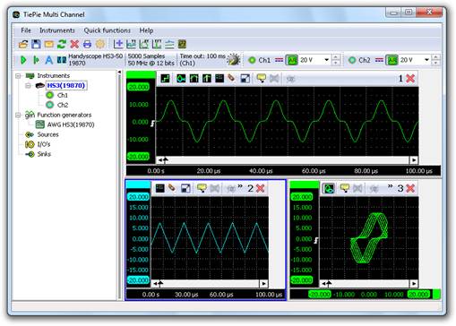 當(dāng)多通道軟件啟動之后,組合的Handyscope HS5就會被識別(每個Handyscope HS5都有一個唯一的編號)然后自動組合成一個更大的儀器。同步總線和觸發(fā)器總線都會因為正確的阻抗而在兩端自動終止。