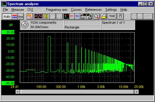 設(shè)置的全范圍讓你控制所有頻譜帶 (FFT bins)、窗口類型、定標(biāo) (linear、log、log/log)和顯示模式(瞬間、平均、或者尖峰保持)。