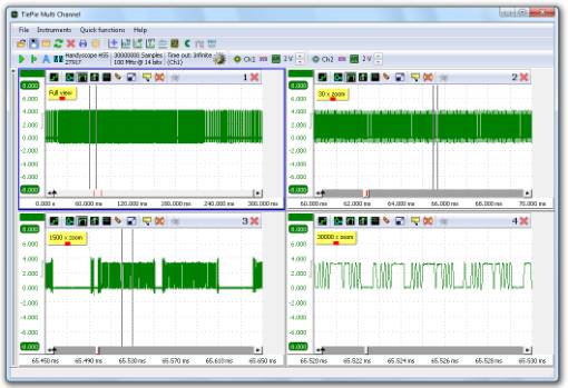 圖中所示為一個30M樣本長度的測量結(jié)果。相同的信號在不同的縮放因子下顯示了四次,右下圖顯示了總長度300ms中的0.01ms的信號,縮放因子為30000。仍然為精確的信號分析提供了充足的細(xì)節(jié)。