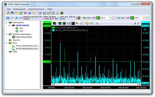 由于Handyscope HS5在頻率范圍的測量有很高的分辨率,所以干擾的檢測和分析精度可以達(dá)到0.1赫茲。高達(dá)16M的頻率分量也可以在圖表中顯示出來。由于Handyscope HS5的高分辨率(14bit 和16bit 分辨率,32M 樣本存儲器),再小的干擾也能輕易被檢測到。當(dāng)使用預(yù)防措施抑制干擾時,其效果也能通過Handyscope HS5立刻檢測出來。由于Handyscope HS5的高分辨率和大存儲器,動態(tài)范圍超過120 dB的頻譜也可以測量。這是同類產(chǎn)品中獨一無二的。因為動態(tài)范圍大,所以失真的測量值可以很好地顯示出來。