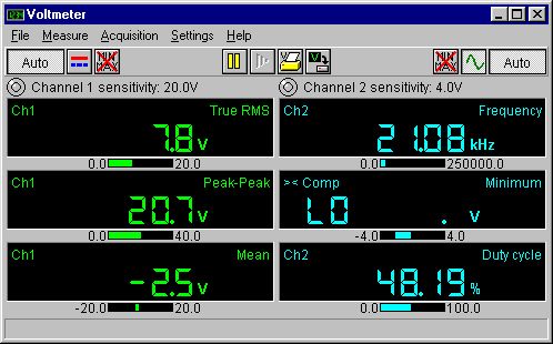 Handyscope HS5有16bit的高分辨率,可以用來做綜合的、精確的高性能數(shù)字萬用表,有很好的技術(shù)參數(shù)(例如均方根RMS、最高峰值、最大值、最小值、平均值、方差、標(biāo)準(zhǔn)偏差、頻率、工作周期、峰值系數(shù)、上升時間、下降時間、dBm總諧波失真(THD)等)。數(shù)值和儀表顯示器都可以使用。Handyscope HS5的1ppm的時基穩(wěn)定且非常精確,使頻率和時間的精確測量成為可能。這些特質(zhì)使額外的萬用表或頻率計成了多余的儀器,這使得Handyscope HS5成為同類產(chǎn)品中獨一無二的。