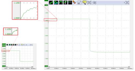 獨立示波器通常只有8bit 或 9bit 較低的分辨率,組合僅有5.7寸或8.5寸的顯示屏,以它們實際的分辨率顯示信號。放大功能也不能顯示更多的信號細(xì)節(jié)。