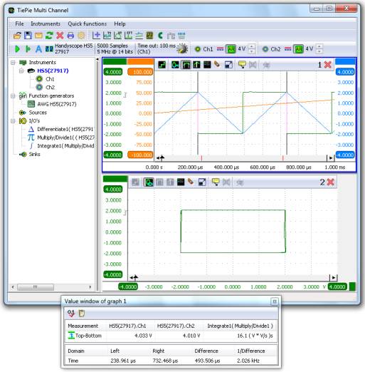 Handyscope HS5的多通道軟件提供了各種各樣的運算操作,如加法、減法、乘法、除法、積分、微分、平方、取對數(shù)等。這些運算操作以程序處理塊的形式加以使用,也可以用來處理測量的信號和參數(shù)信號。
