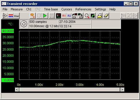 使用溫度測量傳感器,能夠在Windows軟件中,顯示溫度測量信息,測量溫度傳感器提供了測溫探頭和測量儀器之間的接口.溫度測量可以選擇設置成華氏或攝氏溫度,溫度測量探頭位于-40℃到+250℃之間,輸出電壓范圍從-40mV到+250mV,每增加一度,輸出電壓增加1mV.隨機附帶的工程軟件毫伏表功能可用來顯示瞬態(tài)溫度和記錄溫度的最大最小值.另一個有用的特性是使用波形記錄功能記錄溫度隨時間變化的曲線(記錄長度可達9小時)