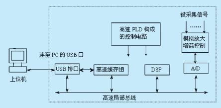 如下圖所示,整個系統(tǒng)采用高速緩存、局部總線、高速dsp等為主的硬件結(jié)構(gòu)。它包含了一個完整的數(shù)據(jù)獲取、處理系統(tǒng),但是它又是具有測試儀器的特色,這主要表現(xiàn)在模擬放大,增益控制和一系列的高速控制電路;局部總線是數(shù)據(jù)采集系統(tǒng)的核心,組成系統(tǒng)的各個模塊均掛接在局部總線上;高速緩存分為兩路,分別負(fù)責(zé)通信接口和dsp之間的上行和下行通信。數(shù)據(jù)采集系統(tǒng)的通信接口可以使用各種方法實現(xiàn),如pc計算機的io口、存儲器窗口映射、dma等。在本文中,采用usb接口傳輸技術(shù),以達(dá)到滿足較高通信速率的目的。