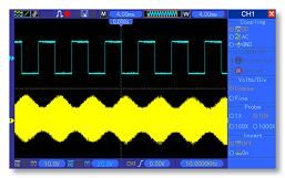 手動(dòng)模式:光標(biāo)間的電壓差△V; 光標(biāo)間的時(shí)間差△T; △T的倒數(shù),以Hz為單位(1/△T)