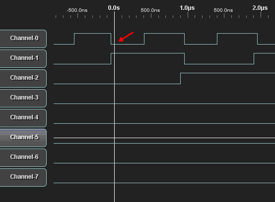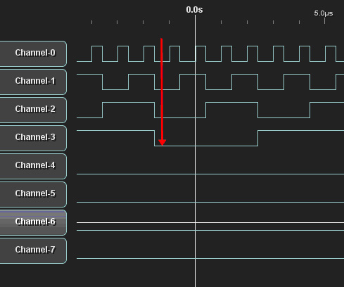 對于8N1的UART,假設需要捕獲數(shù)據(jù)串中的“o”這個字符,ACSII碼0x6F。由于UART低位在前發(fā)送,因此設置觸發(fā)數(shù)值0xF6。下圖為捕獲“o”這個字符的位置。