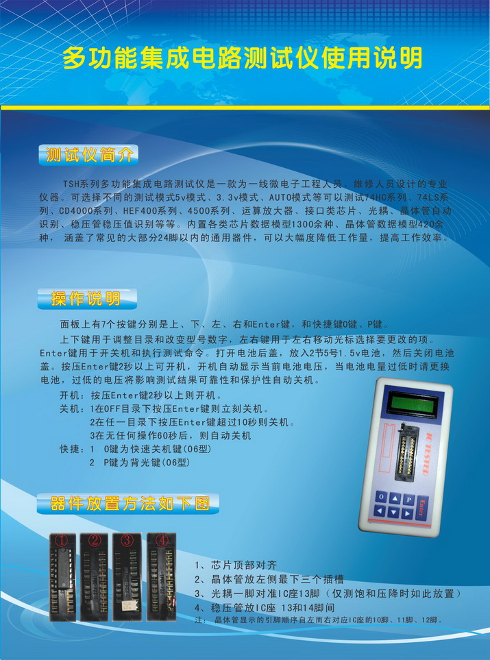 TSH維修精靈是一款專門為一線維修人員設(shè)計(jì)的多功能維修測(cè)試儀,可選擇不同的測(cè)試模式5v模式、3.3v模式、auto模式等可以測(cè)試74ch系列、74ls 系列、CD4000系列、HEF400系列、4500系列、運(yùn)算放大器、接口類芯片、光耦、晶體管自動(dòng)識(shí)別、穩(wěn)壓管穩(wěn)壓值識(shí)別等等。內(nèi)置各類芯片數(shù)據(jù)模型 1300余種、晶體管數(shù)據(jù)模型420余種, 涵蓋了常見的大部分24腳以內(nèi)的器件,可以大幅度降低維修工作量,提高維修效率。